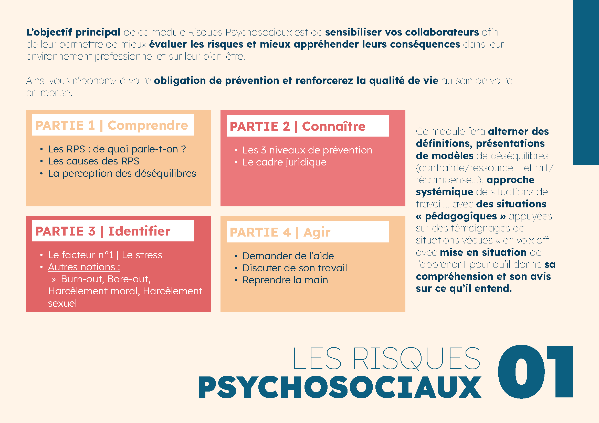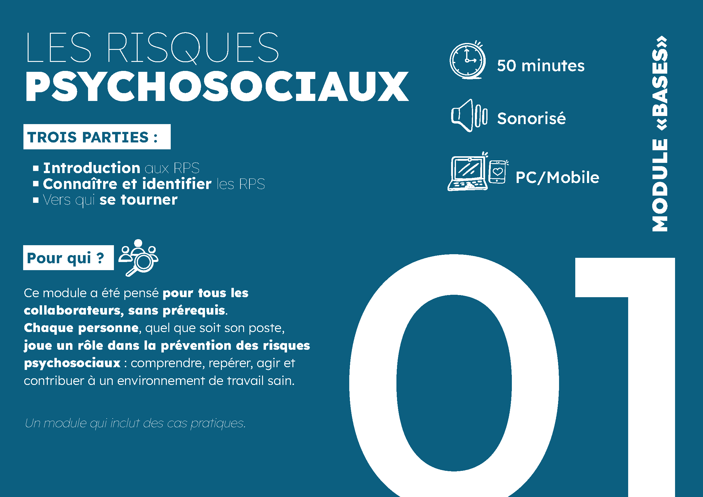 Ce module a été pensé pour tous les collaborateurs, sans prérequis. Chaque personne, quel que soit son poste, joue un rôle dans la prévention des risques psychosociaux : comprendre, repérer, agir et contribuer à un environnement de travail sain.